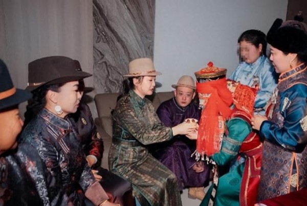照片中,玲花的造型充满地域特色又不失精致。她扎起乌黑长发,头戴一顶浅色编织帽,身上的绿色蒙古袍绣着细密花纹,衬得她身材丰腴匀称,尽显蒙古姑娘的端庄大气。新人向她敬茶时,她双手郑重接过茶水,眼神温柔笑意浅浅,褪去舞台上的飒爽,多了几分长辈的慈爱。坐在她身旁的徐明朝,戴着与玲花同款的编织帽,紫色蒙古袍与妻子的绿色服饰形成鲜明对比,却透着藏不住的情侣默契。结婚14年的两人,眉眼间的神态越来越相似,网友忍不住调侃“这夫妻相简直藏不住”。