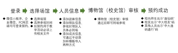 4)公务来访人士、家属、校内协作人员等已持有“中大逸码通行”码的人员可以直接通过“中山大学博物馆校史馆预约”微信小程序办理场馆预约。