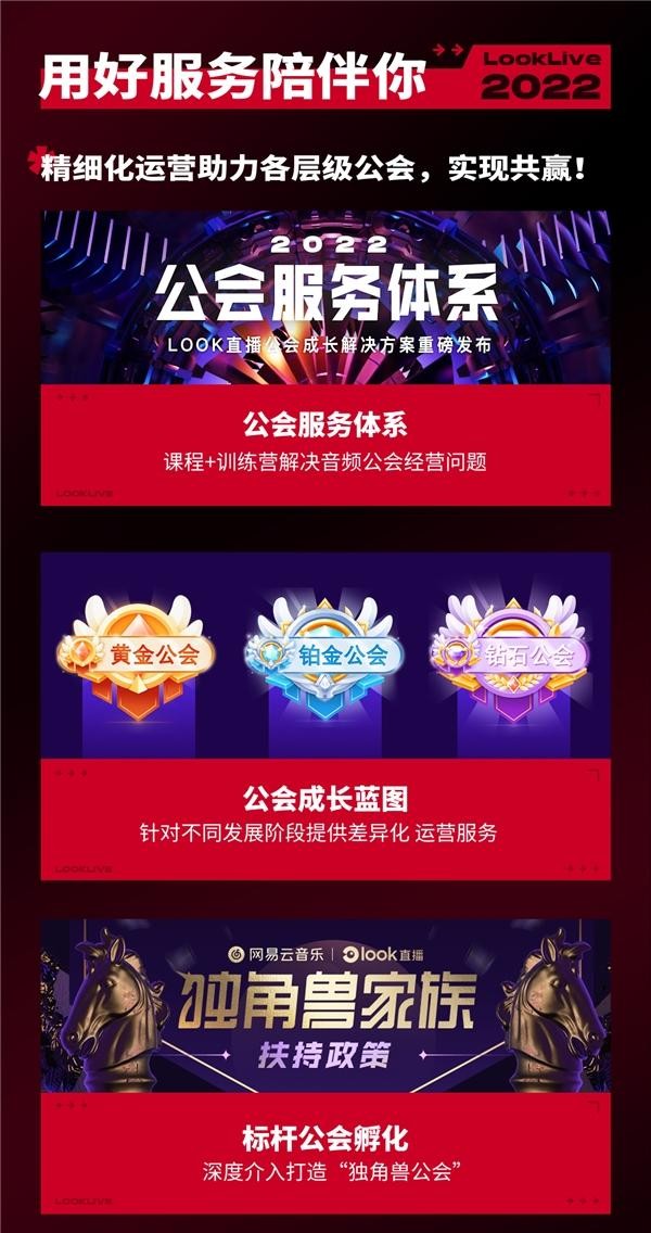 同时,在2022年,LOOK直播也用自己的力量持续推出多项行业扶持项目,助力行业向专业化方向迈进。一方面,LOOK直播搭建了公会服务体系,为公会成长提供解决方案,一站式解决音频公会的经营问题。另一方面,针对处于不同发展阶段的公会,LOOK直播通过赋予其不同的等级,为其提供了差异化的服务。对不同特点、不同优势的公会,平台也提供多元化经营之道助力其发展,描绘了公会成长的蓝图。
