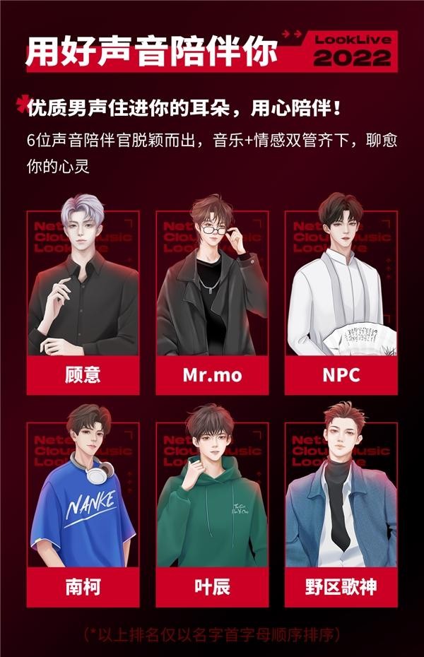 为更好地践行用声音陪伴用户的理念,LOOK直播在2022年也着力打造了优质而又专业的主播团队。除了首席声音陪伴官、MIC男团队长王一浩之外,还有6位声音陪伴官从中脱颖而出,用音乐与情感疗愈用户的心灵。
