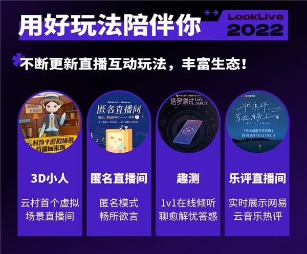 在此之外,LOOK直播在2022年也持续推陈出新,除了每季度都会推出的盛典活动外,还创新了多种直播间互动玩法。先是打造了云村首个虚拟场景直播间,用3D小人与用户沉浸式互动;而后推出匿名直播间,让用户能在匿名模式下畅所欲言;更有乐评直播间,实时展示优质热评,丰富了直播间的内容生态与互动模式。此外,“测测”玩法上线了1V1在线解忧,占卜运势的功能,给用户带来全新的体验。