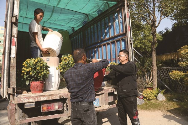 8时30分,最后一盆金桔树从货车上转移到馆舍。李志诚跟工人们一起搬运花盆,“这些花盆都是从漳州精心选购来的,会根据各种花色以及客户喜好,再匹配栽植花卉。搬运时要注意轻拿轻放。”