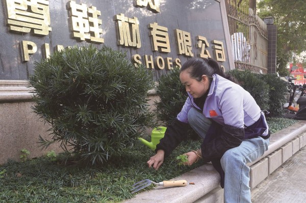 14时,午休过后,小月要赶去为签订了花卉出租业务的两家企业客户做花卉保养。小月说,石狮很多企业都十分重视花卉绿植景观打造,甚至被当做是企业一张靓丽名片,无论是办公场所,还是企业园区,美观大气、色彩艳丽、层次丰富、清新整洁的花丛绿树景致,往往能够给企业的客户留下很深的第一印象。不过,由于景观设计和后续维护都需要相对专业的技术,企业出租花卉业务便应运而生。在宝盖科技园的一家企业铭牌前的绿植景观内,小月用随身携带的铲子,为绿植除草施肥,用剪子修剪整齐,又给整片绿植浇了一遍水。随后赶紧转战下一家,在这里发现有花朵枯萎,小月将其移除后做好登记,以备下次过来时将其替换掉。