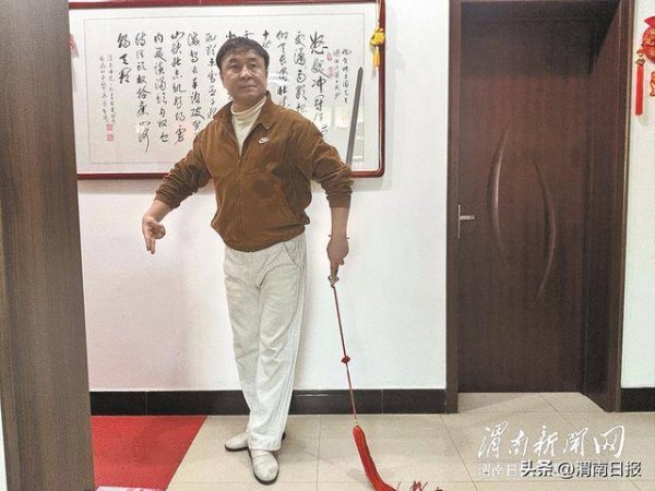 自学戏启蒙起,他便一心扑在戏上,总爱花心思琢磨,晚上在戏校看了《秦之声》,回家琢磨一宿,第二天就能把招式比划出来。苦练武戏的过程中,他摔伤过无数次,却也摔打出一身真本事,十八般武艺样样拿得出手。谈话间,他拿起家中的剑,唱起了岳飞的《满江红》,剑影翩跹、步步生风,尽显武生风采。