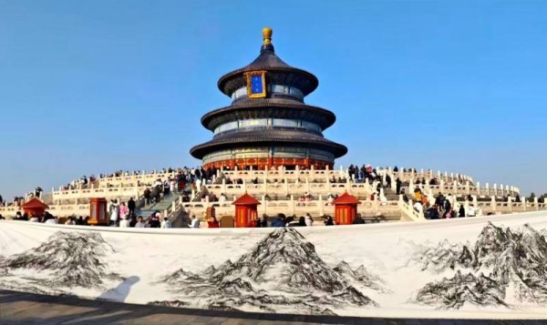“世界和平五洲万里行”巨幅长卷回到中国北京天坛公园