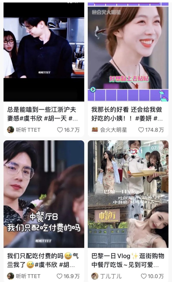 抖音上热度集中在胡一天虞书欣cp,姜妍“小姨感”的视频上,而微博热度最高的还是5天前的#综艺替身#热搜。除此之外,今年《中餐厅8》没有更多引起讨论的话题。