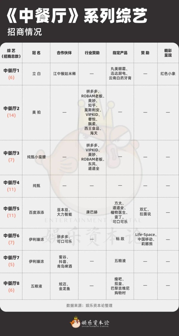 02 商业路径拓宽,背靠芒果以小搏大另一方面,《中餐厅8》的商务品类正在拓宽和升级。