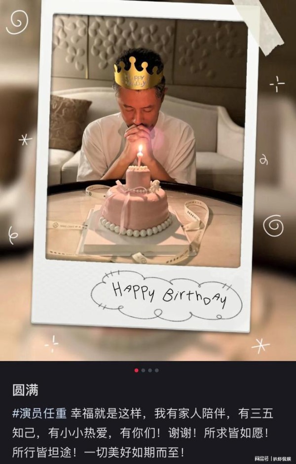 从任重晒出的庆生照中可以看出,当天他是在家中度过46周岁生日的,家人为他准备了一个简约粉色的蛋糕,并插上一根蜡烛,任重则戴上“王冠”,双手紧握托住下巴,闭上眼睛认真许愿。