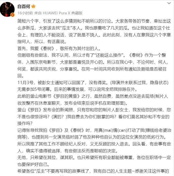 等到11月6号,白百何终于憋不住了,发了篇长文把事儿说清楚了。你猜怎么着?原来她在东京参加电影节的时候,被制片人提前打发回国了。人家告诉她没得奖,让她先走,结果呢?剧组其他人该吃吃该喝喝,继续在日本参加闭幕式。这不是摆明了欺负人嘛!更气人的是,最后王传君拿了影帝,导演张律拿了最佳导演,就她一个人被蒙在鼓里,连颁奖典礼都没赶上。