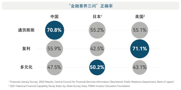 本次调查中,受访者在国际上常用的某本“金融素养三问”中全部答对的比例仅为24.4%。与美国、日本等国相比,中国居民在通胀问题中的表现较好,对复利、多元投资等概念的认知仍有待夯实。