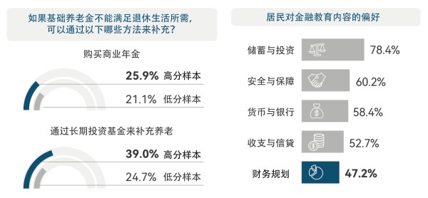 尽早进行合理的养老规划是保障居民安享晚年的重要一步。报告显示,金融素养较高的群体更倾向于在储蓄之外通过多元的渠道补充养老所需,但居民对财务规划相关知识和技能的教育需求总体偏低,仍需着力提高居民对科学财务规划理念和方法的掌握和运用。