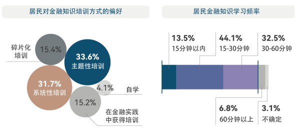 主颢性和系统性金融知识培训是最受居民青睞的金融教育方式,目九成以上受访者每次学习金融知识的时长在1小时以内。各方应基于受众需求优化教育策略,形成教育者和受教育者之间的双向互动,更好地提升居民对金融教育的参与度和认可度。