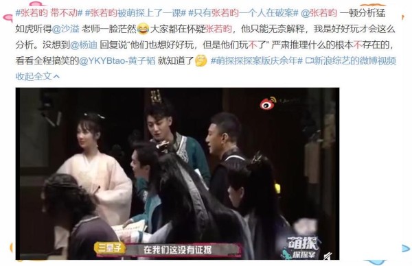 再来看这档节目,播出几期以来,虽然话题不断,但整体好评并不多。有网友批评节目定位模糊,更像是一场“假探案、真闹腾”的闹剧,后期剪辑也受到了不少质疑。在这样的背景下,飞行嘉宾张若昀似乎肩负着引领节目节奏的重任,但遗憾的是,他并未能成功带动节目氛围。而张若昀对于综艺节目的参与度并不高,他坦言拍戏已经占据了他大部分的时间。