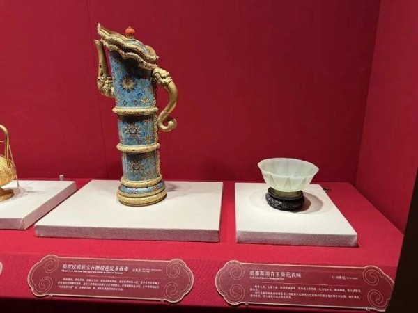 一件满、蒙、藏等民族用来装奶茶、酥油茶的多穆壶,结合了宫廷掐丝珐琅技艺,缠枝连纹、铜胎鎏金、宝石镶嵌,异常精美。“这体现了中华文明多元一体、交流融合与和谐共生的美好图景。”故宫博物院讲解员表示。