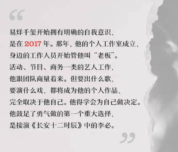 12月3日,易烊千玺最新采访内容曝光,他坦言2017年是自己自我意识开始明确的节点,而当时他鼓起勇气做出的首个重大抉择,便是接下《长安十二时辰》里李必这个角色。