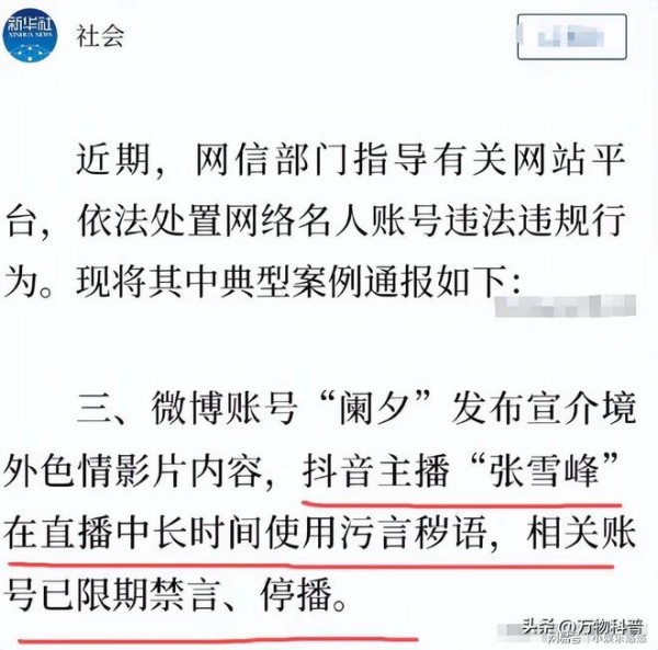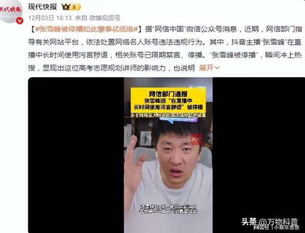 12月3日,“网信中国”明确点名,抖音主播张雪峰因“直播中长时间使用污言秽语”,相关账号被限期禁言、停播。