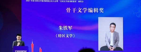 近日,2025年度全国文学报刊联盟会员大会暨“全国文学报刊联盟奖”颁奖会在广州举行。深圳市《特区文学》杂志社社长、总编辑朱铁军凭借深耕文学期刊二十余年的专业坚守与突出实绩,获评“骨干文学编辑奖”,成为本次全国仅有的6名该奖项获得者之一。