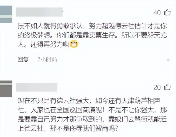 但也有不少网友表示:技不如人就要勇敢承认,然后努力的超越德云社,毕竟有才华不怕没观众。