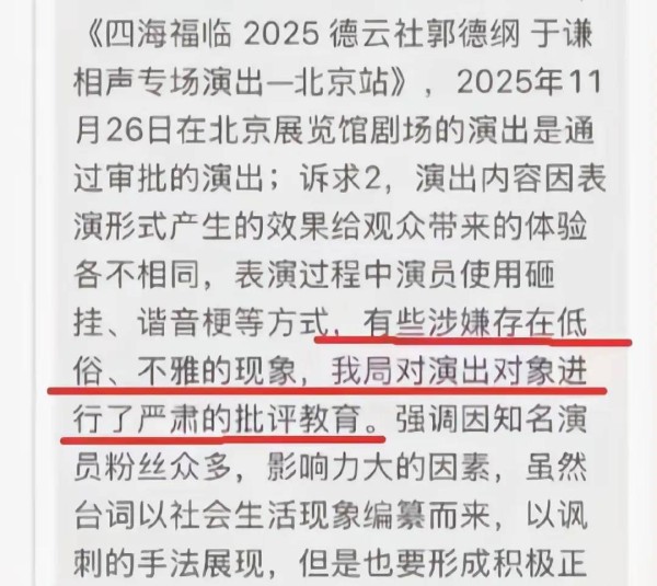 随后,北京12345热线针对此投诉内容进行了回应,强调他们已经约谈郭德纲,称被投诉的内容在整改之前不能再次演出!