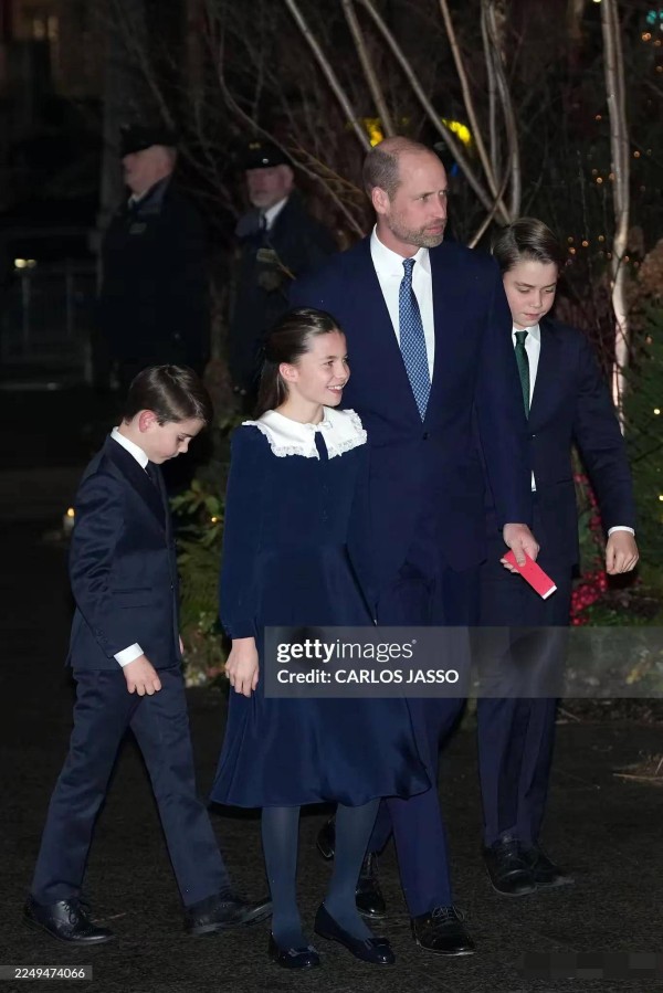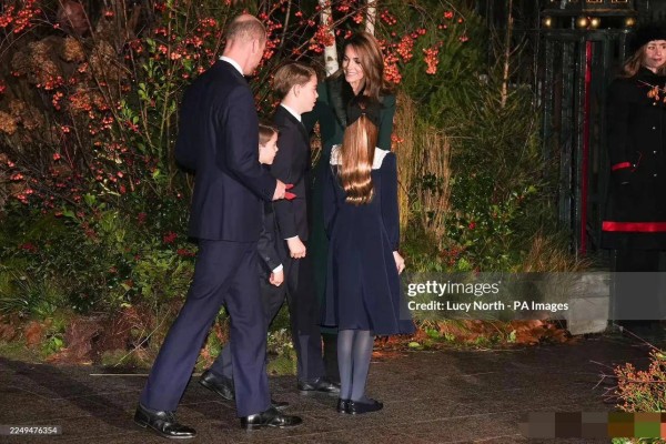 说到全家人的打扮,这回可有点意思。妈妈凯瑟琳王妃独树一帜,一身绿色大衣,仿佛冬日里一抹生机勃勃的常青藤。而其他四位,威廉和三个孩子,则清一色穿着深蓝色系,整齐得如同一片深邃宁静的夜空。不得不感叹,这家的基因真是没得挑,父母都是瘦高个子,孩子们也个个继承了这优点,往那儿一站,就是一道养眼的风景线。