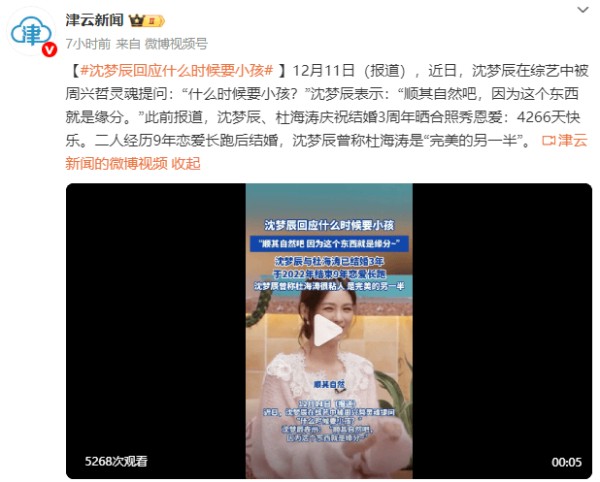 近日,沈梦辰在某综艺里被周兴哲犀利提问:“什么时候要小孩?”对此,沈梦辰坦然回应:“顺其自然吧,毕竟这种事讲究的就是缘分。”而就在此前,沈梦辰和杜海涛还晒出合照庆祝结婚3周年,配文“4266 天快乐”,甜度爆表。据悉,两人曾经历9年恋爱长跑才步入婚姻殿堂,沈梦辰更是不止一次称赞杜海涛是自己“完美的另一半”。