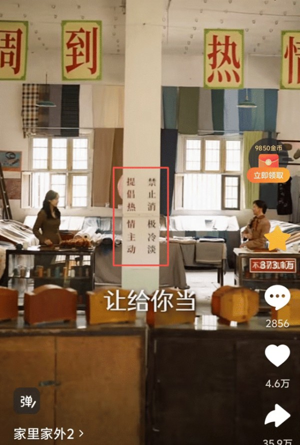 另一个细节是,蔡晓燕跟她嫂子比赛扯布的时候,镜头前面的柱子上,分别用红色和黑色写了两列字,提倡热情主动,禁止消极冷淡,分别对应蔡晓燕和她嫂子,像是提前为观众贴好了标签。