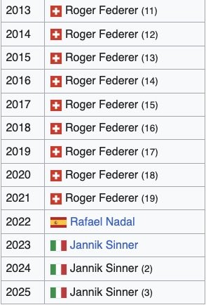 [辛纳连续三年当选最受欢迎单打球员],是投票,按票数评的。这个“最受欢迎单打球员”奖是2000年成立的,费德勒连续拿了19年。辛纳目前拿了3次。萨芬拿了2次,库尔滕和纳达尔各拿了1次。#辛纳连续三年当选最受欢迎单打球员##辛纳蝉联年度最受欢迎单打球员#