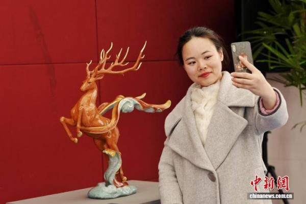 12月12日,朱炳仁、朱军岷艺术作品捐赠入藏仪式在北京中国国家博物馆举行。图为观众与入藏作品《国鹿》自拍合影。 中新社记者 张祥毅 摄