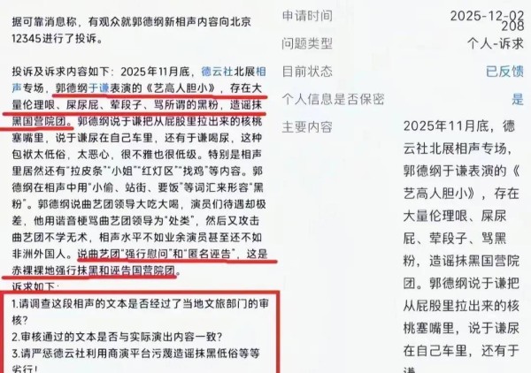 理由很简单,德云社家大业大,郭德纲更是公认的相声大师,普通观众或者普通主流相声艺人的投诉很难达到这样的效果,说白了,这位投诉者也非等闲之辈