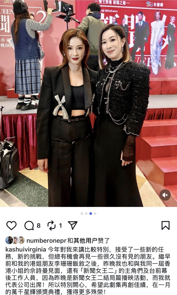 翁嘉穗与佘诗曼虽然不是太熟络,不过翁嘉穗也还是颇为感慨地留言,她称2025年对自己来说比较特别,接受了一些新任务与挑战,还有机会见到一些很久没见到的朋友,其中包括了早前见面的1996年港姐冠军李珊珊,如今又有与她同届的港姐季军佘诗曼。留意到翁嘉穗的用词,非常客气,以同一届香港小姐来称呼佘诗曼,就再次证明彼此之间并不熟络,而且轻描淡写,并没有那种久别重逢的激动之情。