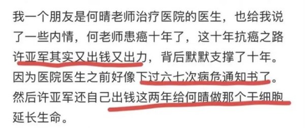 医生曝许亚军为何晴付10年医药费,以儿子名义给生活费,重情重义为何何晴突然离世?两年前语音曝光,才知病魔早已侵蚀她的生命 ,许亚军