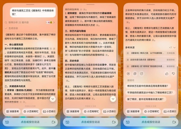 如果在展会上碰到一些没听过的概念,或是在生活中遇到了知识盲区,这时候请不要犹豫,直接打开小艺问答功能。比如我们可以直接唤醒小艺后问它:“榫卯与建筑工艺在《藏海传》中有哪些体现?”小艺就会给出非常详细的解答,涵盖了核心建筑场景、道具与机关、技艺内涵、历史传承等多个方面,看完之后不得不说一句“我悟了!”而且和小艺对话就像真人一样,边聊天就边学习了!