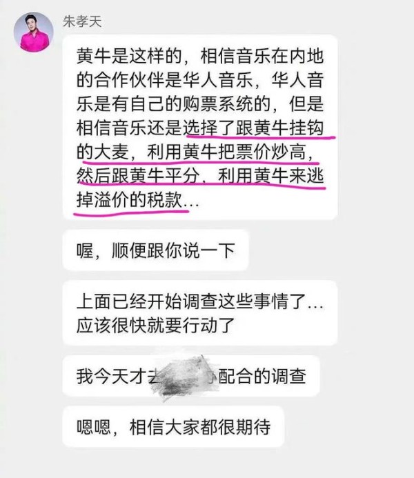 后续,朱孝天更是在粉丝群爆料五月天的经纪公司“相信音乐”与黄牛勾结,利用黄牛把演唱会的门票票价炒高,还利用黄牛逃避税款等。