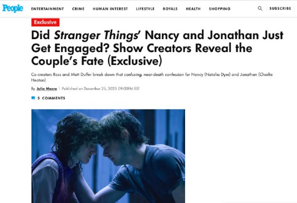 #TNABO# 《怪奇物语》制作团队澄清S05 Vol.2的一段重要场景(剧透慎看),,,,,,,,,,,,,,,,,,,,,,在接受People杂志采访时,马特·达菲回应南茜·威勒跟乔纳森·拜尔斯被困在霍金斯实验室的场景,表示这不是订婚成功,恰好相反:“这是一次分手。这个构思具体是何时形成的很难回忆起来,但是我觉得我们以及所有编剧,都感觉南希最后需要靠自己独立生活,有机会追寻自我。”马特补充说,很少有人最后会跟自己高中时期的男女朋友走到一起,虽然南希跟乔纳森之间的关系比大多数学生情侣要更复杂。罗斯·达菲表示,两人的关系属于“创伤纽带”。