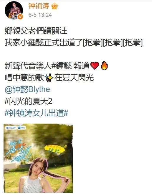 而钟镇涛早前在社交网发帖,表示「乡亲父老们请关注,我家小钟懿正式出道了」,在韩红担任总导演的音乐综艺节目《闪光的夏天》中亮相,以星二代身份而受到关注。
