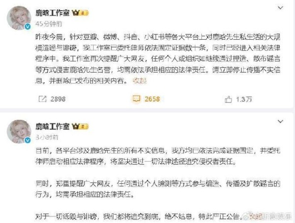 鹿晗工作室无疑是反应最迅速的,短短几小时内连发两条声明,直接把 “大规模造谣诽谤”“固定数十条证据”“进入法律程序” 等硬核表述砸出来,还精准点出豆瓣、微博等传播平台,勒令网友删帖止损,那架势仿佛在说 “别等传票上门才慌”。