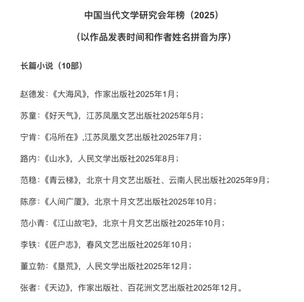 ▷中国当代文学研究会年度榜单(2025)发布。赵德发《大海风》、苏童《好天气》等10部长篇小说入选;刘汀《富贵如云》、班宇《清水心跳》等10部中篇小说入选;邓一光《海水快乐地说》、沈念《镜中》等10部短篇小说入选。此外,还有散文集、诗歌集、非虚构等榜单同期发布。