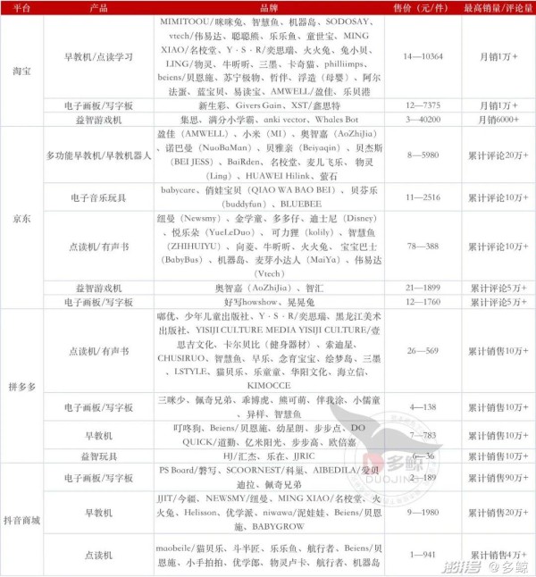 表 1 主要电商平台热销幼儿电子教育产品(备注:1. 表格中的「售价」为某一品类所有产品的最低售价和最高售价。在各平台上搜索某品类关键词后选择按价格排序,并确认为主产品价格后,得出该品类产品的最低价和最高价区间。2. 品牌一栏内的第一个品牌即为在该电商平台上搜索该品类产品,选择按销量排序后出现的首位品牌。)