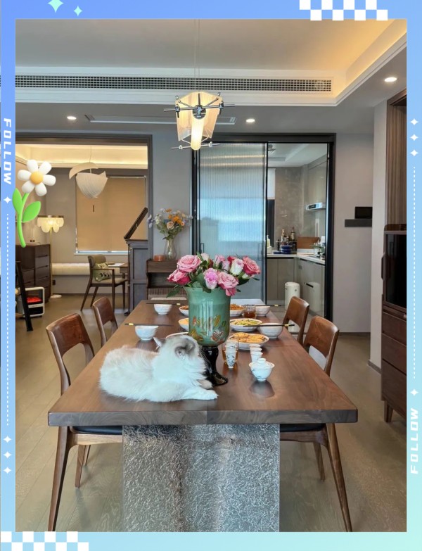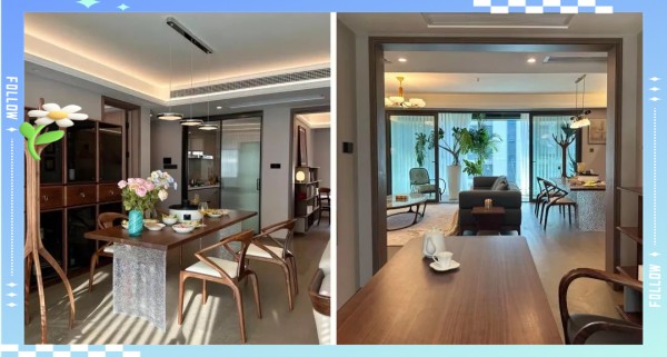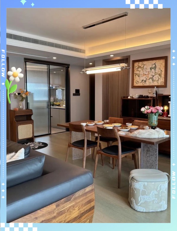 餐厅的灯光与家具搭配得恰到好处,营造出温馨的用餐氛围。深棕色的实木餐椅,线条流畅简洁,与那张雕刻精致的长桌相得益彰。特别值得一提的是桌腿所采用的磨砂玻璃设计,既保证了桌子的稳固耐用,又使其整体呈现出一种轻巧而精致的美感,充分展现了女主的独到眼光。 餐厅设计精致且真实,深棕色实木餐椅与精美长桌搭配,磨砂玻璃桌腿独具匠心,设计融入日常生活。