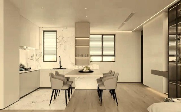 现代简约风格常采用开放式厨房与客厅设计,使空间更开阔 #生活技巧# #家居装饰建议# #现代简约装饰#