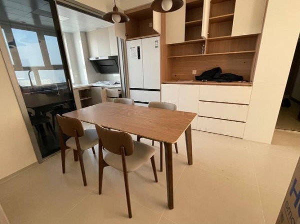 低饱和色系如同自然的滤镜,为餐厅增添了一抹清新。运用木、白、石材的融合,创造出简约而不失格调的生活氛围。真正懂得生活的人,会将美的体验融入日常的每一刻。原木色的桌面与墙面自然衔接,其轻盈的质感让就餐时光变得更加轻松愉悦。这样的设计,无疑使餐桌更显现代气息。
