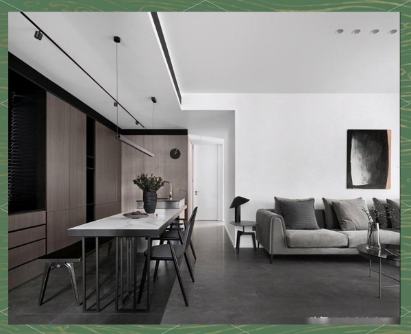 例如,客厅中木饰面的运用,为黑白灰的空间增添了一抹温暖的色彩,避免了空间的冷清;而主卧的浅绿色设计,则让黑白灰的空间焕发出活力,消解了沉闷的氛围。这种色彩搭配不仅符合科学家的研究,还能平衡人的情绪,更体现了老祖宗的智慧,遵循了“过犹不及”的调和原则。