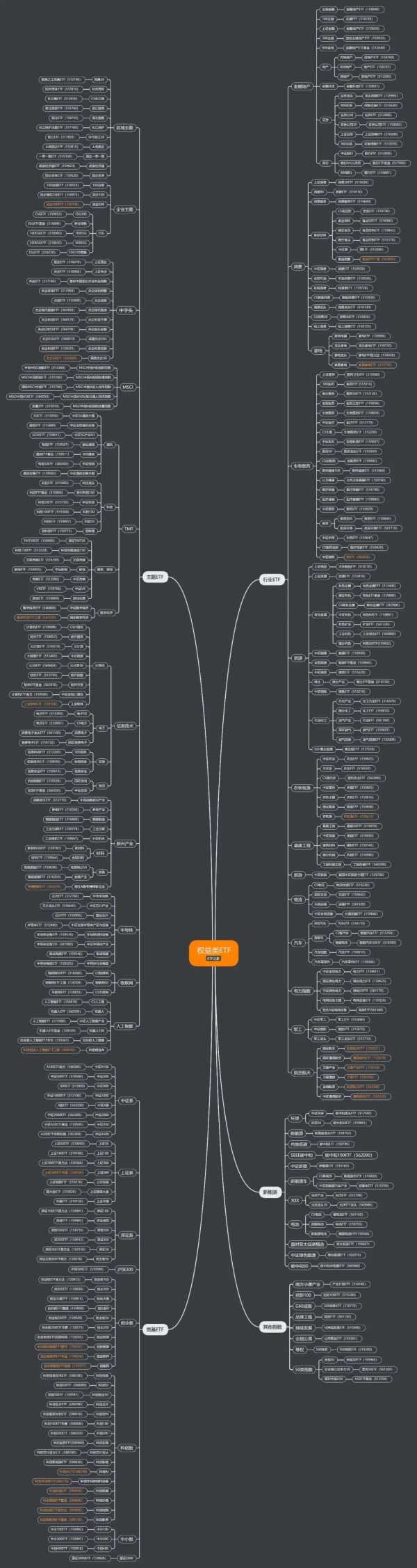 其余年度上新标的统一标记成橙色,大伙看权益类ETF最全脑图吧: