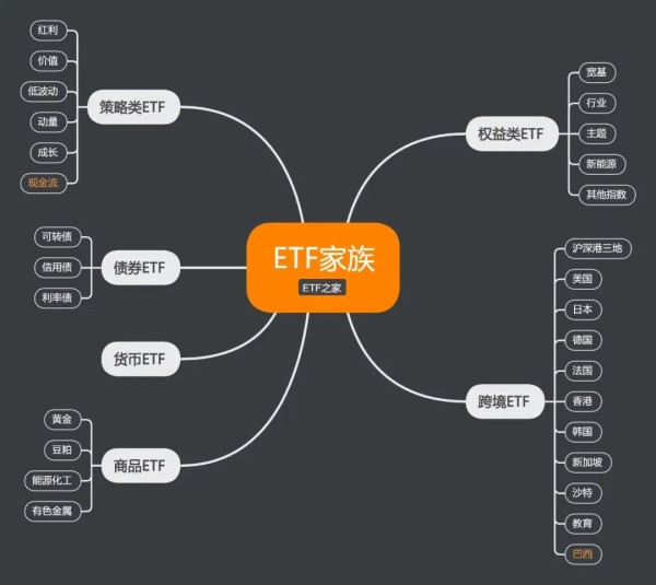 时至今日,ETF数量之多,规模之大前所未有。如果一只只介绍,一来是篇幅过长,二来是知识点过于分散,不利于学习查找,因此我们把ETF大家族从资产类别着手分为六类,分别是权益类ETF、策略类ETF、债券类ETF、商品ETF、跨境ETF、货币ETF,详细如下图: