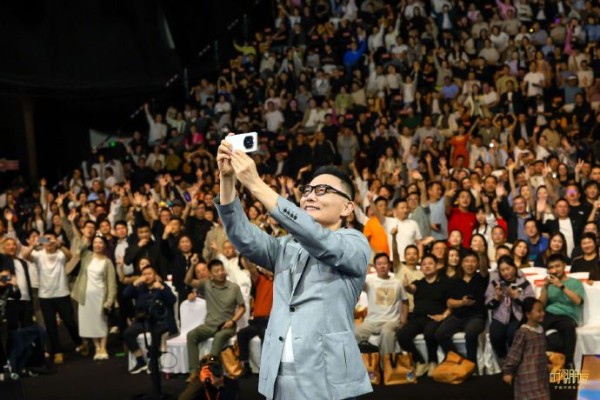 全场折叠屏合影:零点用华为Mate X7拍摄全景照片,寓意“展开新未来”;