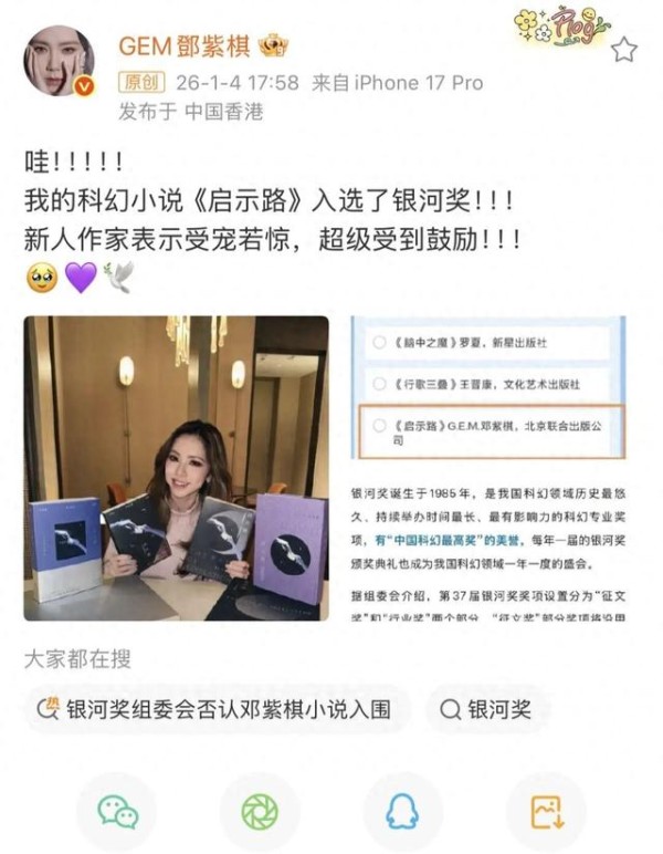 近日,华语乐坛知名歌手邓紫棋出版于2025年7月的首部长篇科幻小说《启示路》现身第37届银河奖海选投票“最佳原创图书奖”一栏,引发热议。邓紫棋为此发微博称:“新人作家表示受宠若惊,超级受到鼓励!!!”