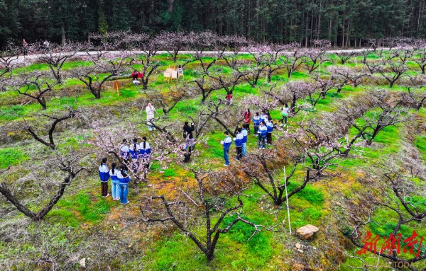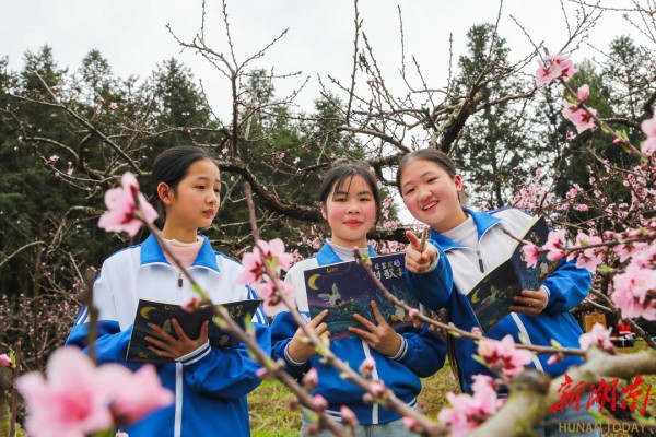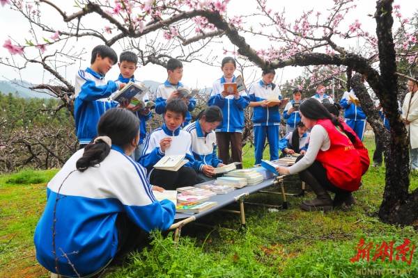3月11日,新田县骥村镇组织新时代文明志愿者和骥村中学诗歌社团学生在该镇麻子塘水果基地桃花林开展“以书润心、悦见美好”读书分享会,通过观赏桃花、阅读书籍、学写诗歌等活动,让孩子们在祖国大美河山中接受熏陶,激发读书的激情,享受阅读乐趣。(刘贵雄 彭定国 摄影报道)