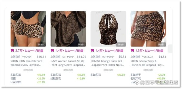 2025年春夏的印花趋势展现出强烈的市场导向,其中豹纹印花成为最大赢家。数据显示,其趋势指数达到100,年增长率高达86.8%,并在SHEIN等快时尚平台上持续热销,豹纹短裙、吊带上衣等单品的月销量均突破1.3万+,部分款式增长率甚至超过257%。相比之下,棋盘格印花的市场表现同样亮眼,年增长率高达217%,成为年轻消费群体中的爆款元素。同时,精致花卉和动物印花的市场接受度显著提升,分别增长47%和14.5%,传统的花卉图案也保持稳健增长(+8.3%)。整体来看,2025年春夏的图案趋势正呈现两大核心方向——一方面,豹纹、棋盘格等视觉冲击力强的图案持续走红,另一方面,花卉等经典元素通过更精细的设计手法焕发新生,品牌在产品开发时可结合这些趋势,精准迎合不同市场需求。