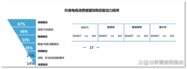 服饰消费的多样化趋势愈加明显,不同年龄段的消费者在平台上的活跃程度差异明显。新中年消费者逐渐成为主要市场力量,他们偏好通过品牌店铺或直播来购买产品,而年轻消费者则更倾向于通过短视频或社交平台直接下单。特别是对于新中年群体,其在购买频率、客单价以及购买数量上的增长速度都表现出强劲的趋势。与传统的零售方式不同,这些消费者在网上的购物体验更加灵活和个性化,对产品的需求也更加细分。