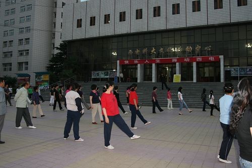 跳舞时间里,广场上聚满了参加学习的人们。台上舞蹈老师一边踩着舞步,一边讲解着要领,台下教职工聚精会神地跟着老师的舞步,一个节拍一个节拍地学着。不一会儿,大家就能跟着节奏娴熟地跳起来。一个小时下来大家已是大汗淋漓。有一位老师说:“平时晚饭后就在家看电视,排舞活动让他走出了家门。”一位老师讲“自从学了广场排舞,整个人的精神都不一样了。”还有的老师希望增加跳舞时间。
